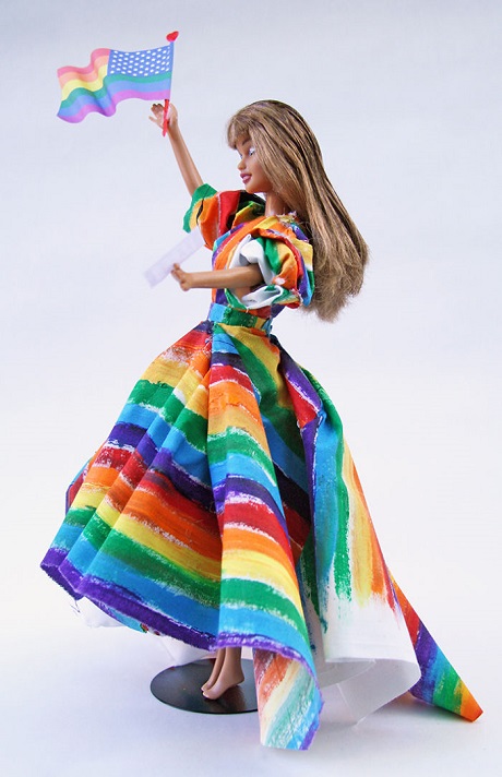 On June 26, 2015, the U.S. Supreme Court struck down all state bans on same-sex marriage, legalized it in all fifty states, and required states to honor out-of-state same-sex marriage licenses in the case Obergefell v. Hodges. This upcycled Barbie celebrates the momentous occasion with a a hand-painted, rainbow print fabric.